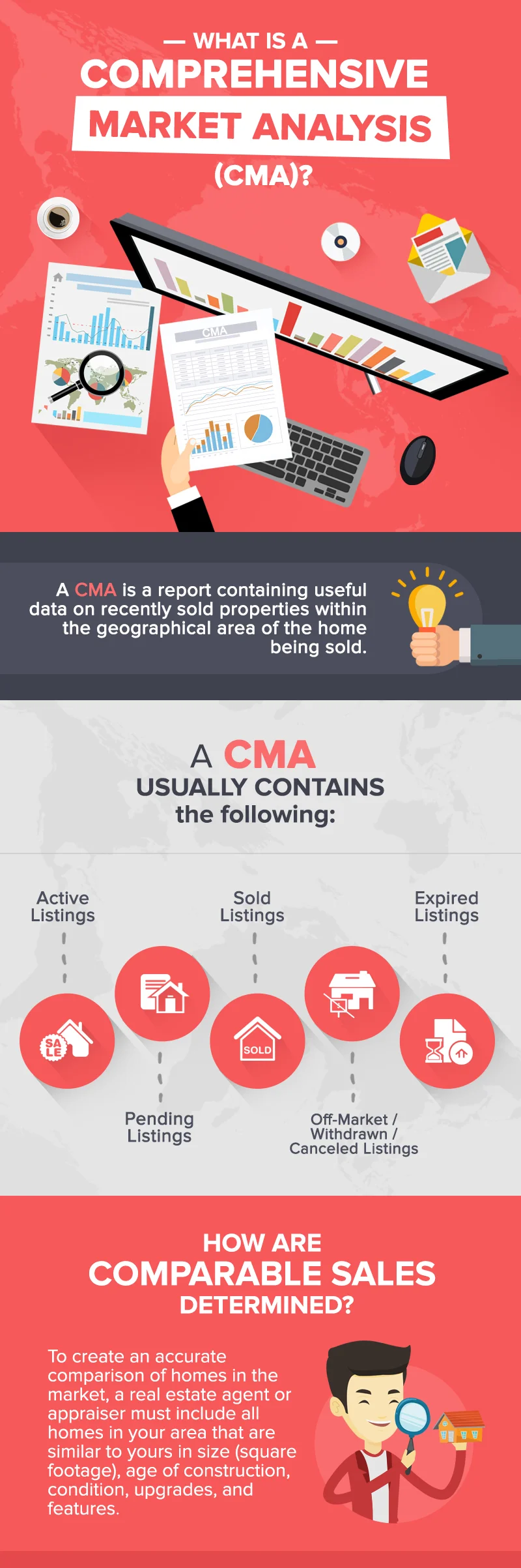 A CMA is a report containing useful data on recently sold properties within the geographical area of the home being sold. The length of the report can vary widely — some being a concise 2-3 page list of comparable home sales, and others reaching up to 50 pages that include comprehensive analyses and guides.